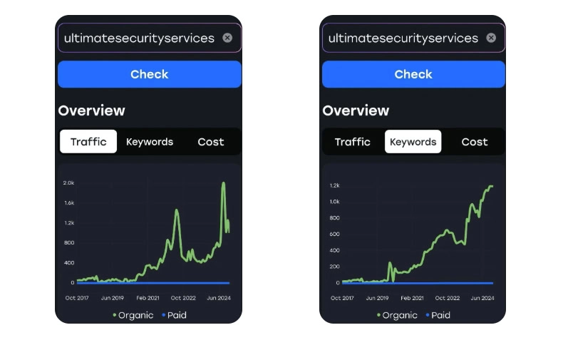 Result: USS now ranks #1 on Google for security guard services in Toronto, outperforming over 140 competitors. They rank for more than 1,200 keywords and consistently attract 2,000+ monthly visitors, securing a steady stream of qualified leads.
